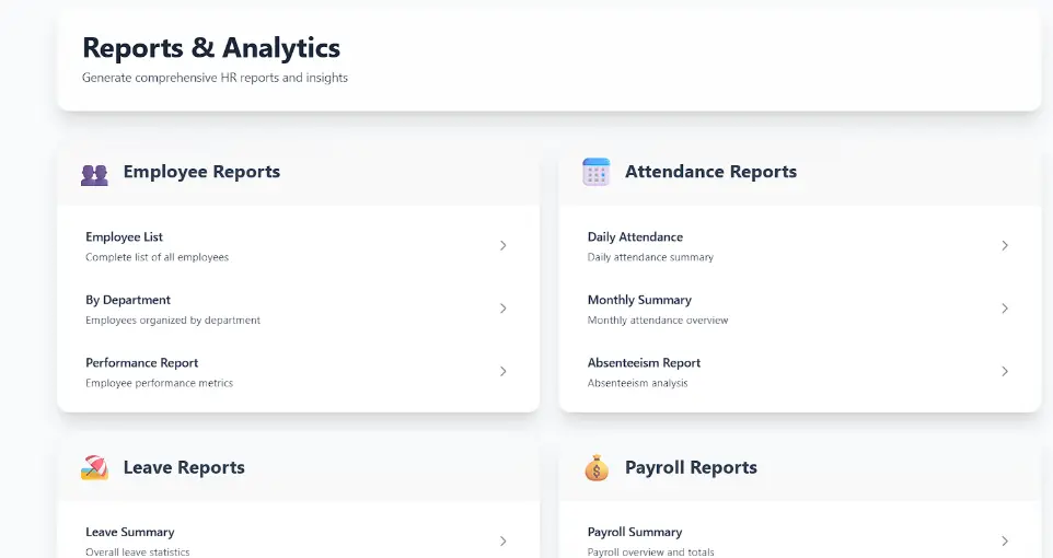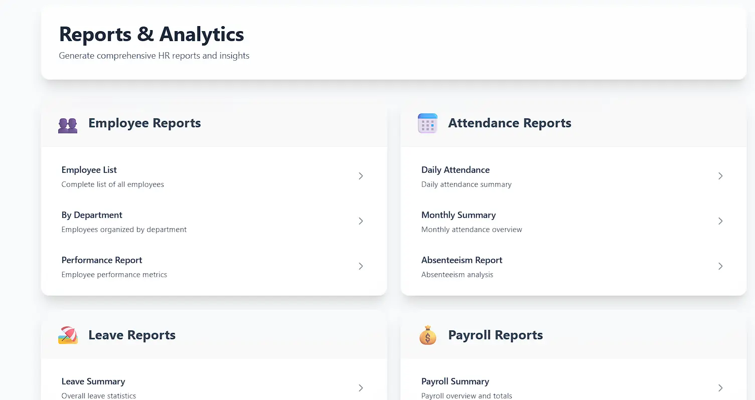 Custom HR dashboards and reporting systems — secure, auditable, and decision-ready.
